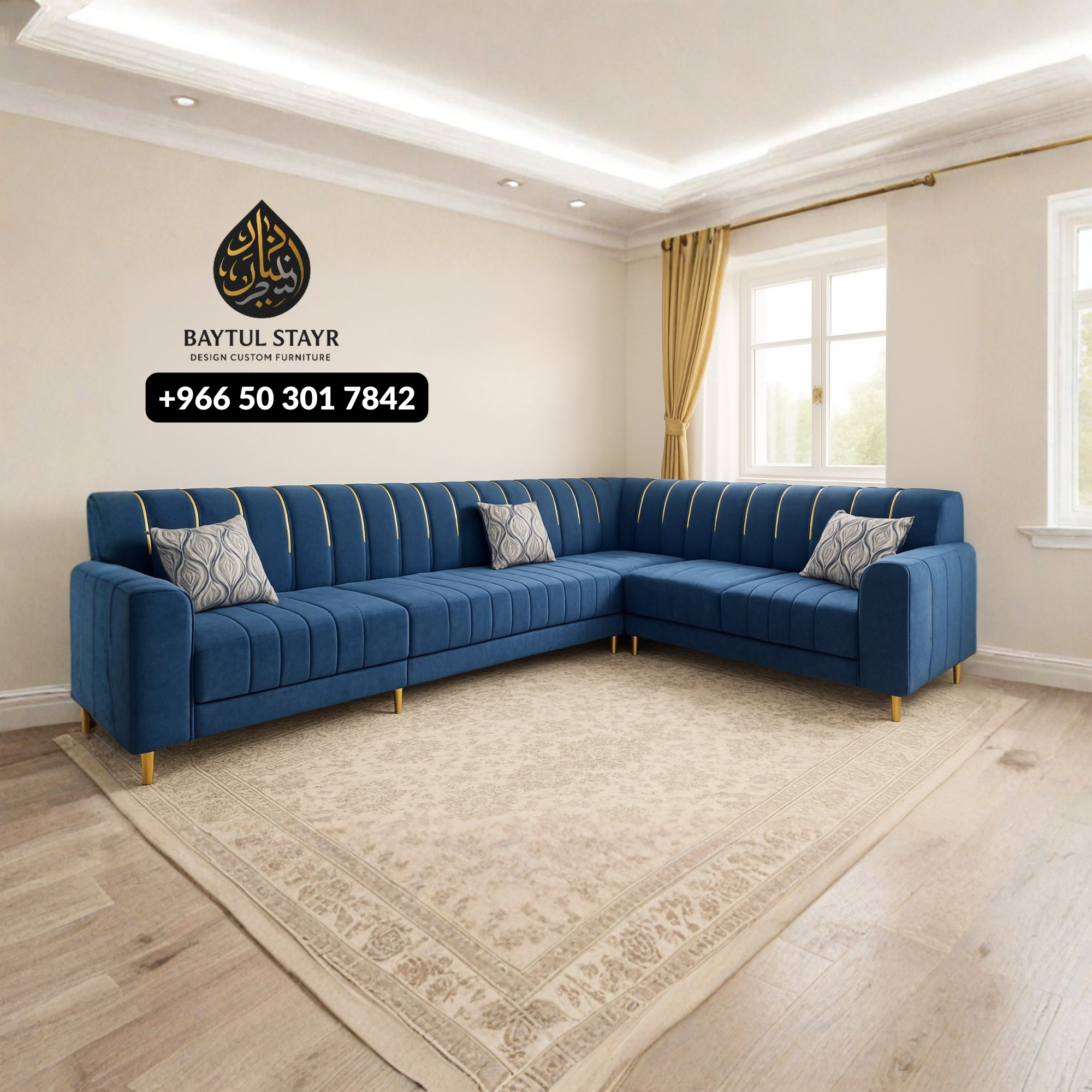 Elevate the style and comfort of your home with this American Majlis Sectional Sofa, featuring a luxurious royal blue fabric accented with elegant gold stripes. Expertly crafted in Riyadh, this U-shaped sofa is designed specifically for spacious majlis seating areas and modern Saudi interiors.