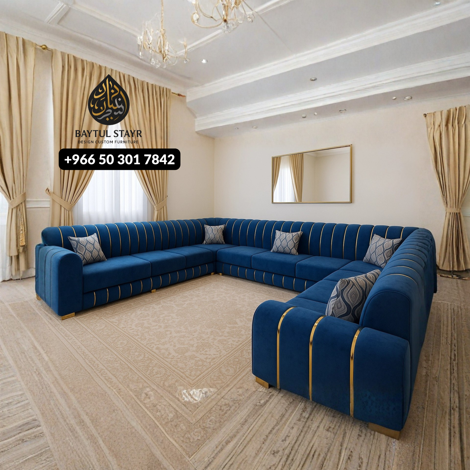 Elevate the style and comfort of your home with this American Majlis Sectional Sofa, featuring a luxurious royal blue fabric accented with elegant gold stripes. Expertly crafted in Riyadh, this U-shaped sofa is designed specifically for spacious majlis seating areas and modern Saudi interiors.