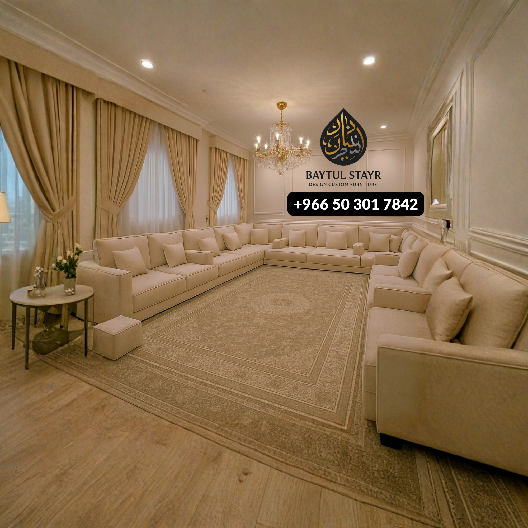 Buy Living Room sofa in Riyadh. Perfect for majlis. Custom colors, solid wood, free delivery. Baytul Styar Interiors – Haraj Bin Qasim, Riyadh.
